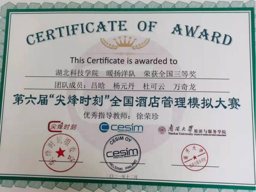 (本网讯通讯员:徐荣珍 吕晗)经过近两个月的激烈角逐,第六届“尖峰时刻”全国酒店管理模拟大赛圆满落下帷幕,我院酒店管理专业两支队伍荣获三等奖,分别是许慧卿老师指导的三带一队、徐荣珍老师指导的暖扬洋队。