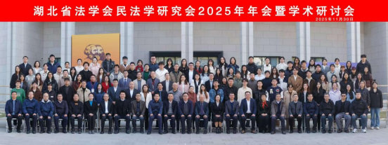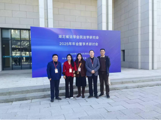 (通讯员:郑敏;审核:张建军)2025年11月30日,在华中师范大学文科科研楼一楼报告厅,召开了湖北省法学会民法学研究会2025年年会暨学术研讨会。本次会议由湖北省法学会民法学研究会主办,华中师范大学法学院承办,湖北中和信律师事务所、武汉中南瑞达教育协办,会议主题为“民法典实施中的疑难问题研究:争鸣与共识”为主题的学术研讨盛会。研讨会汇聚了省内外二百余名高校专家学者、法律实务界精英及青年学子,我院由湖北省法学会民法学研究会常务理事张建军教授,理事刘波副教授、郑敏副教授,团队教师何于华副教授、林淑飘老师一行5人参与本次年会交流学习。