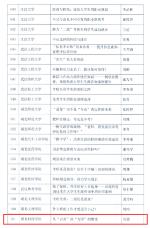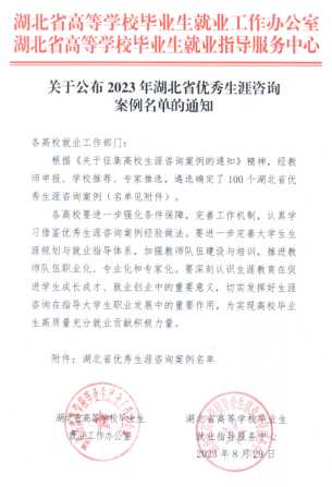(通讯员:孙珏 审稿人:吴乐盈)近日,湖北省高等学校毕业生就业工作办公室、毕业生就业指导服务中心公布了“2023年湖北省优秀生涯咨询案例”,我校776net必赢官网党委副书记刘波的生涯咨询案例《从“言商”到“为国”的嬗变》入选,该案例也是我校唯一入选案例。