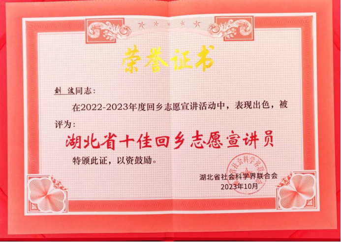 (通讯员:王晶;审稿:吴乐盈)2023年10月13日,在湖北秭归举办的湖北省社科普及工作推进会暨省社科普及骨干培训班上,776net必赢官网党委副书记刘波副教授被湖北省社科联评为2022-2023年度湖北省“十佳”回乡志愿宣讲员。