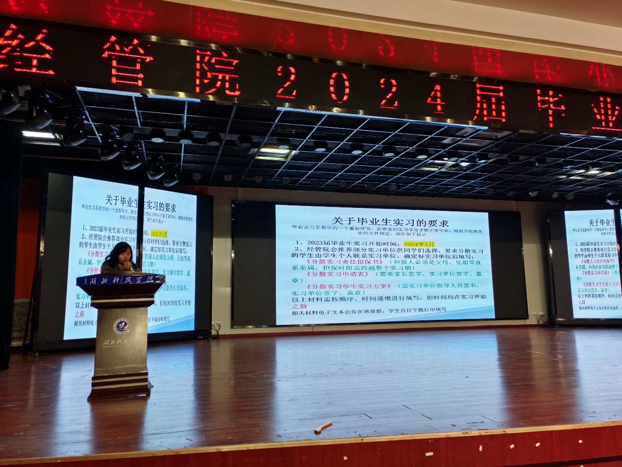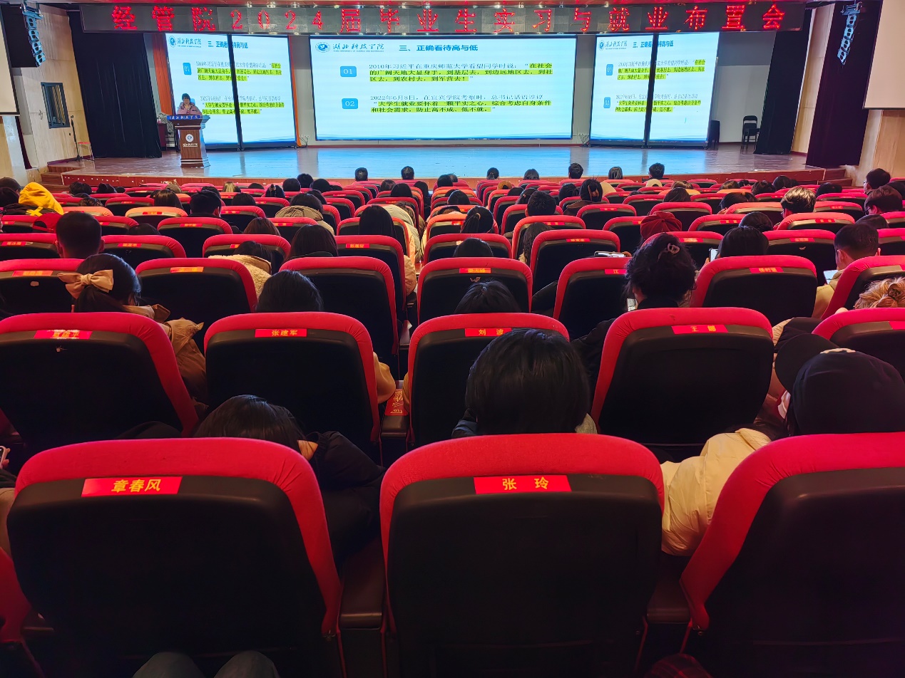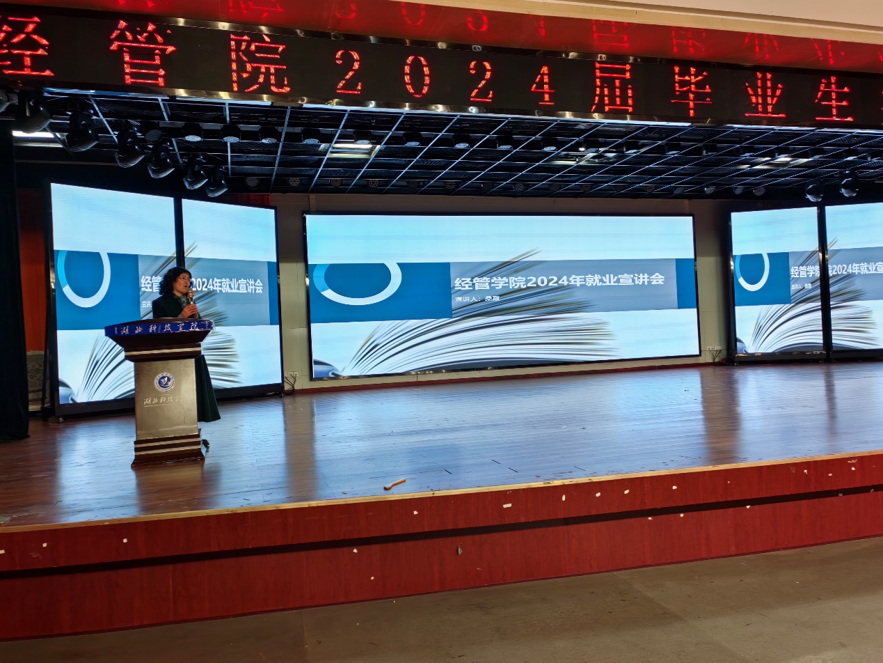 (通讯员:王晶 审稿人:刘波)为贯彻落实党中央、国务院对高校就业工作的决策部署,扎实推进学院就业指导与服务工作,坚持底线思维科学指引,主动适应新形势新要求,不断提高我院人才培养质量,进一步做好学生毕业就业工作,促进经管学子高质量充分就业。经济与管理学院于2024年1月1日晚,在图书馆学术报告厅组织2024届毕业生召开就业工作专题会,学院全体领导班子成员、 2024届班主任、辅导员和经管院2024届毕业生参加会议,特邀招商银行、长江证券、新华保险公司代表现场宣讲,会议由院党委副书记刘波主持。