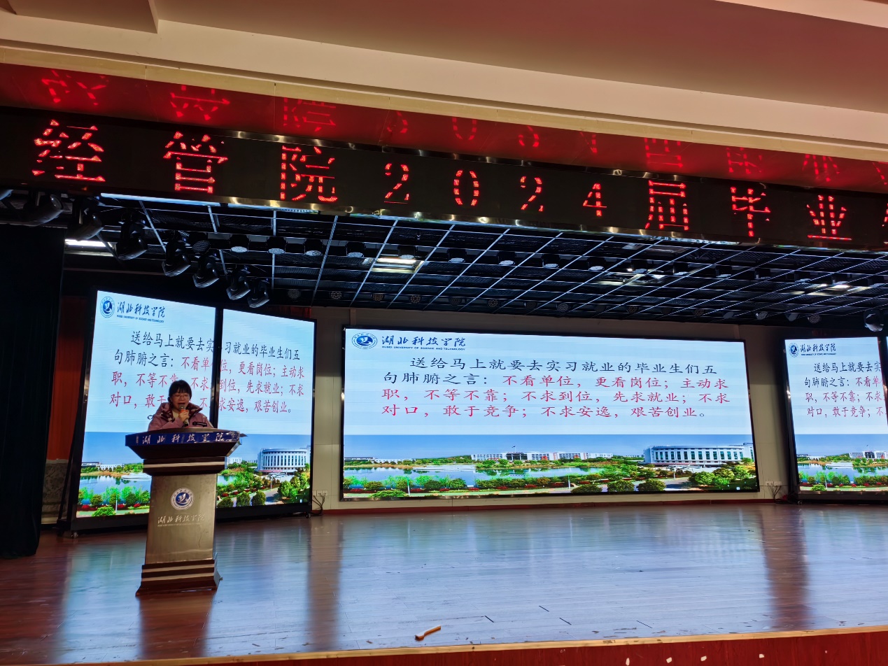 院党委书记吴乐盈以《乘风好去看山河》为主题,结合思政教育与就业环境鼓励24届毕业生在实习就业过程中要坚持“自找苦吃、苦中有乐,先做小事、再成大事,立志要高、起步要低”;结合776net必赢官网往届优秀校友熊丹桂、刘东海的光荣事迹,勉励全院毕业生“不看单位、看岗位;主动求职,不等不靠;不求到位,先求就业;不求对口,敢于竞争;不求安逸,艰苦创业”