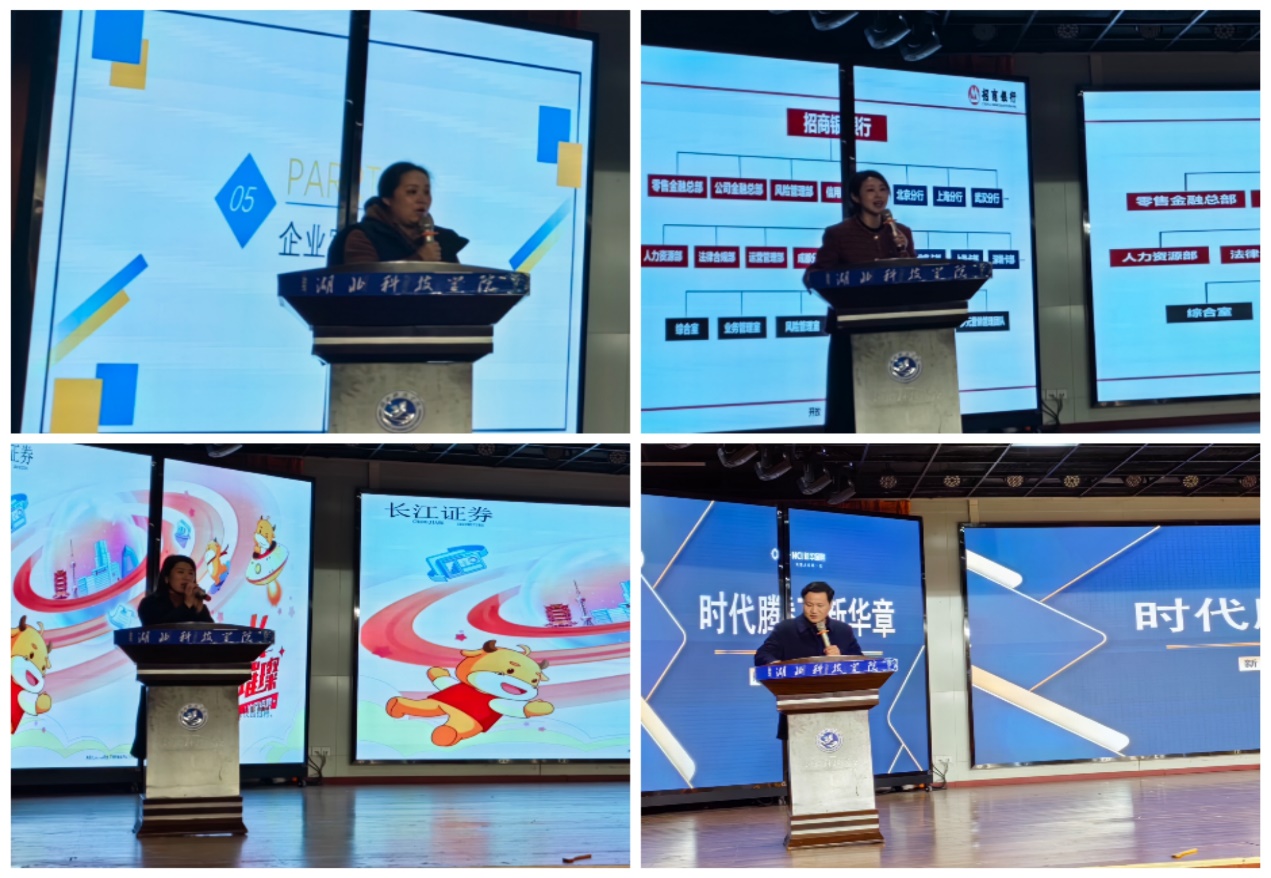 在企业宣讲会上,有来自招商银行武汉分中心、长江证券咸宁分公司和新华保险咸宁分公司的人事经理现场开展企业宣讲,他们详细介绍了公司文化、晋升通道、福利待遇等等具体情况,诚挚邀请我们的毕业生加入。作为特邀的优秀校友就业企业,新华保险咸宁分公司还特意介绍了本院17届校友朱程的成长经历。