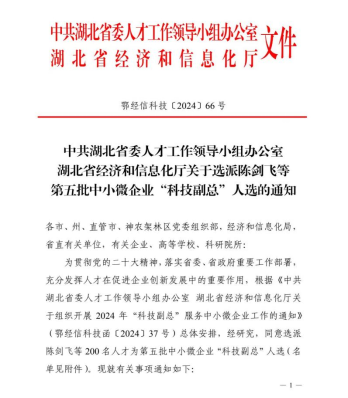 (通讯员:蔡青青、叶芬 审稿人:张建军)近日,中共湖北省委人才工作领导小组办公室、湖北省经济和信息化厅联合发布《关于选派陈剑飞等第五批中小微企业“科技副总”人选的通知》(鄂经信科技〔2024〕66号),我院蔡青青老师成功入选,这是我院教师在省级“科技副总”人才项目上的首次突破。