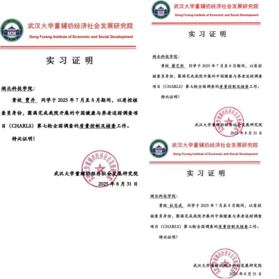 (通讯员:李若暄;审稿人:刘波)近日,中国健康与养老追踪调查(CHARLS)第七轮常规调查质控暑期活动顺利收官。此前,经我校 “一职有我” 工作坊发布通知、严格选拔推荐的贾丹、杜思武、游林、蔡艺彤、杭蕊 5学子,于 2025 年 7 月至 8 月以质控核查员身份全程参与调查。其中 4 人凭出色表现获得武汉大学董辅礽经济社会发展研究院的高度认可,顺利拿到相关实习证书,为此次实践经历画上圆满句号。